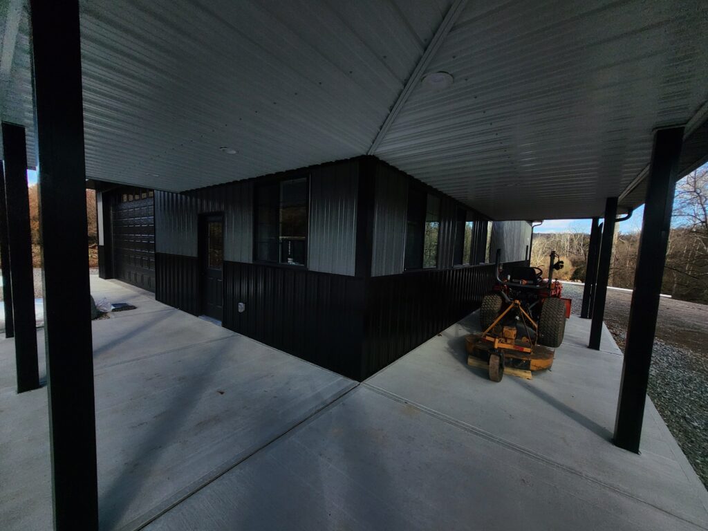 This 40′ x 60′ post-frame building is sure to turn heads. It’s packed with custom features from top to bottom. Black windows, entry, and garage doors give the exterior a sharp modern look, while the wrap-around porch adds some character to the exterior.