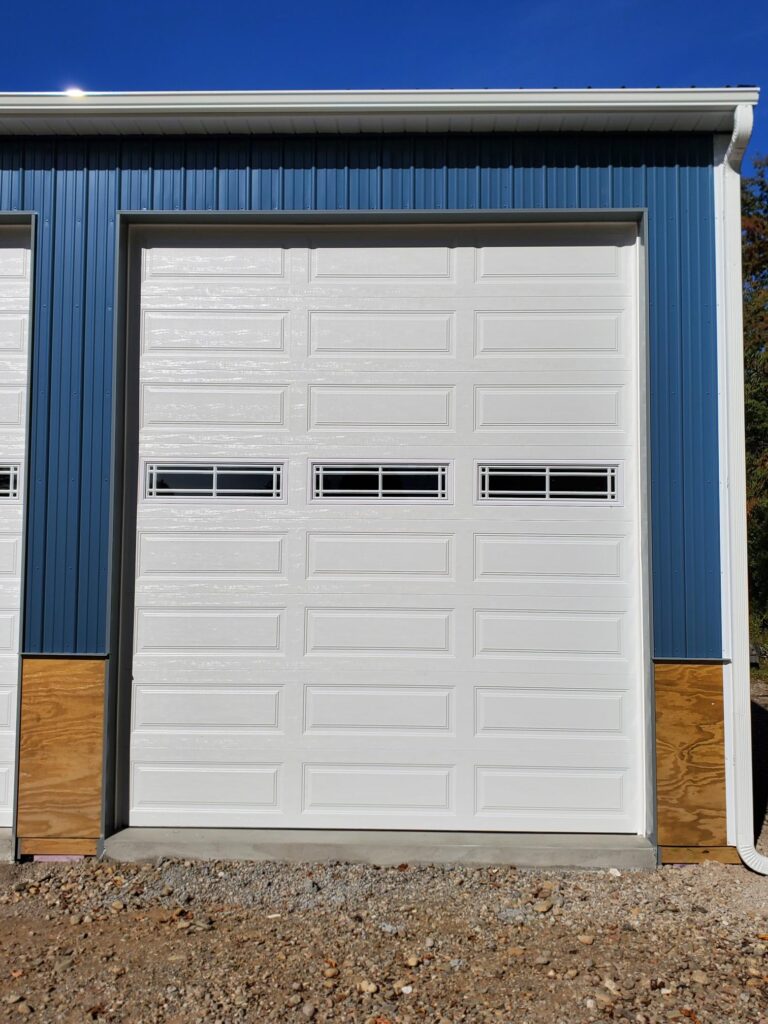 The Ocean Blue siding, Slate wainscoting, and Brite White trim give the building a crisp look. To take it a step further, we installed 4′ treated plywood on the front eave for the customer to add stone veneer — a custom touch that will make this build a true showpiece. From layout to finish, this building blends commercial function and looks good to!